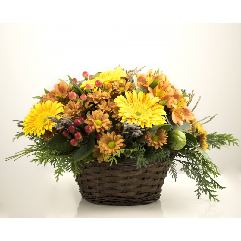 Cesta de flores variada con gerberas , margaritas, alstroemerias, hypericum.. 25 cm altura y 40 cm diametro