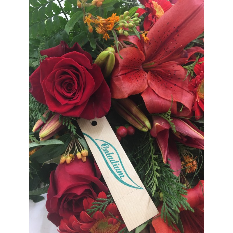 Decir adiós con toda la fuerza y pasión que simboliza el color rojo, en una combinación de flores con rosas. Largo 70 cm ancho 40 cm( medidas aproximadas)