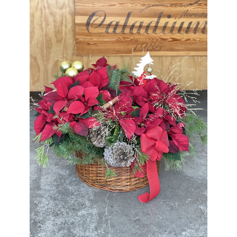 Magnífica cesta artesanal de fabricación local con 4 posentias y decoración con motivos navideños (altura 60 cm diámetro 85 cm.Medidas aproximadas)