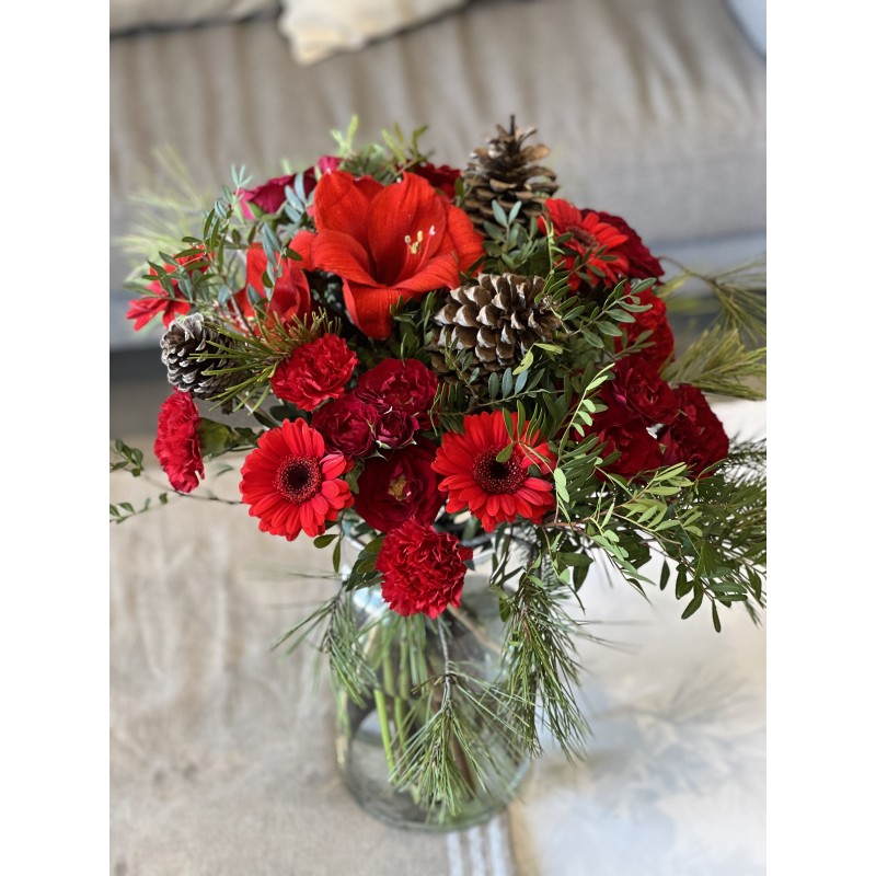 Ramo en rojo con pinos, piñas… elegante trabajo natural.diámetro 35 cm aproximado