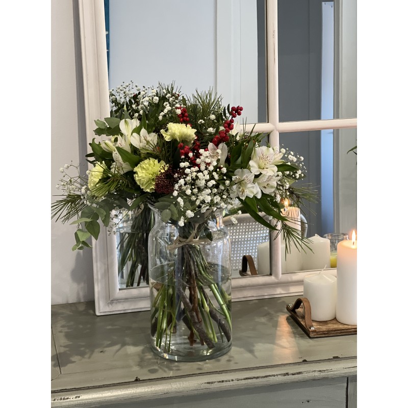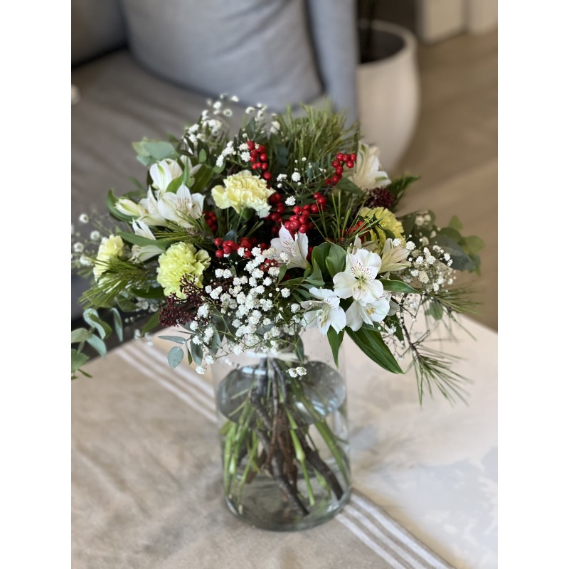 Agradece con este ramo desenfadado, informal, campestre con base de pinos, alstroemerias blancas, ilex rojo , clavel y paniculata.