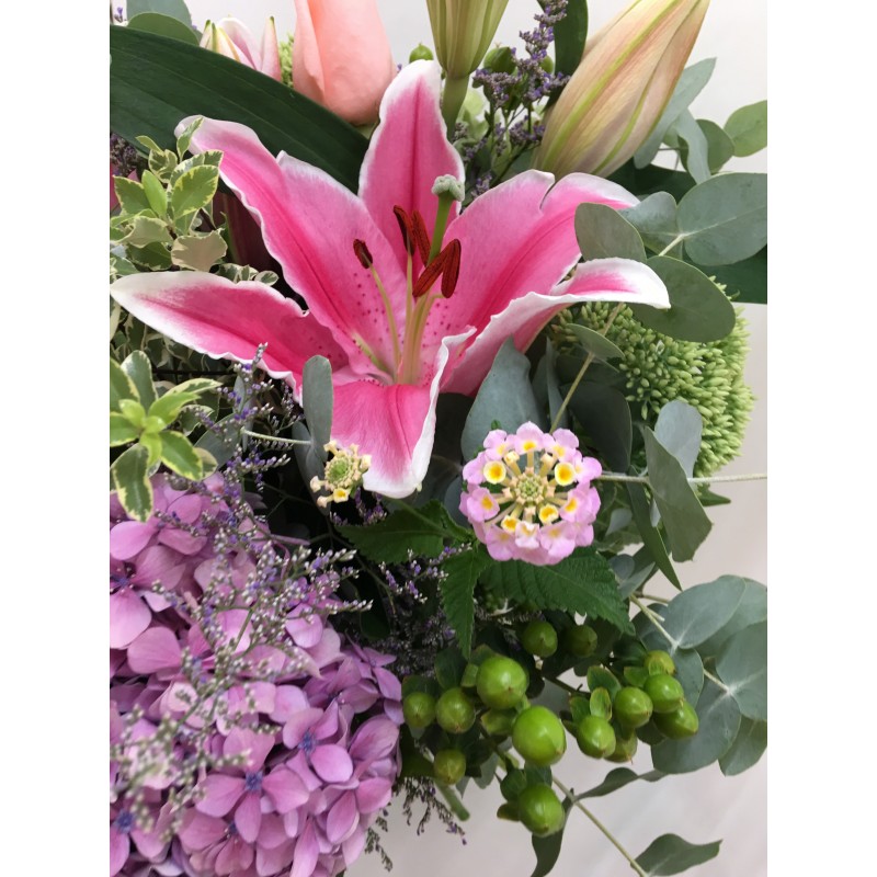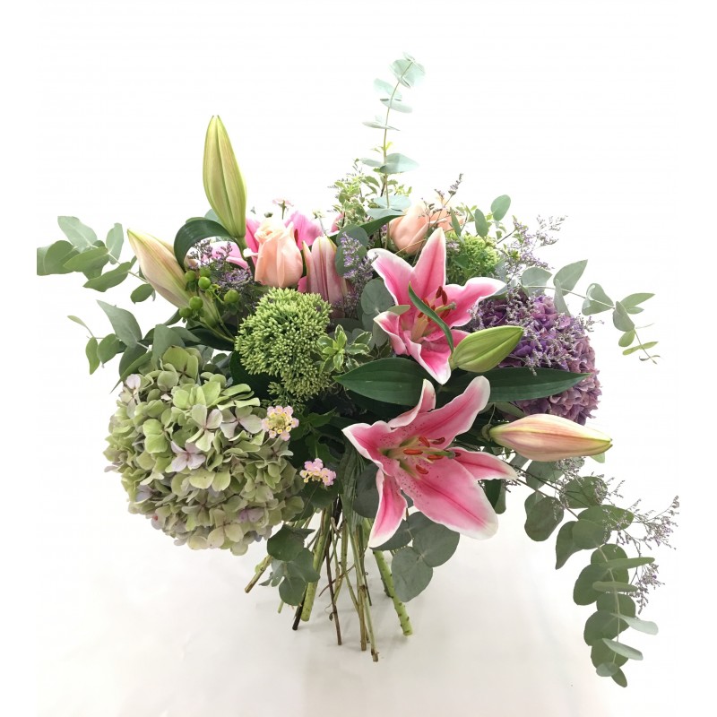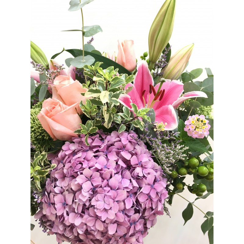 Ramo de flores variadas, hortensias gallegas, y eucaliptos,este ramo solo esta disponible en la tempoara otoño. Diámetro 50cm altura 40cm aproximado.