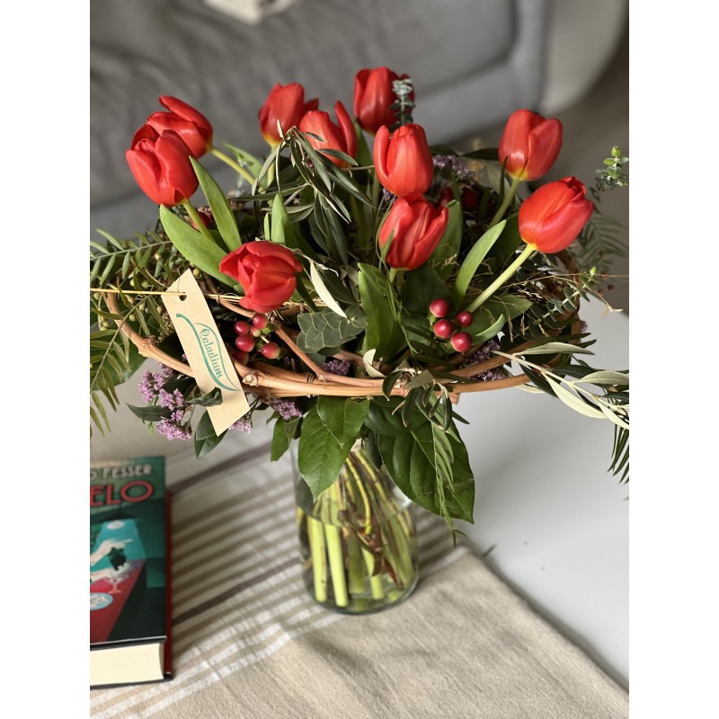 Bouuet de 1o tulipanes rojos con estructura de sarmientos (Handmade)