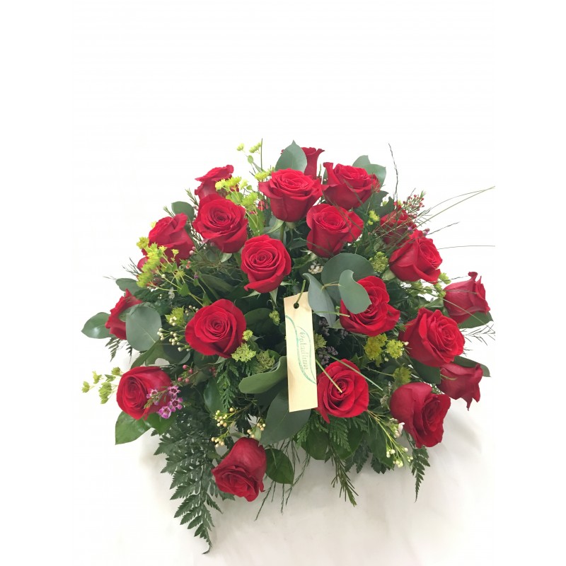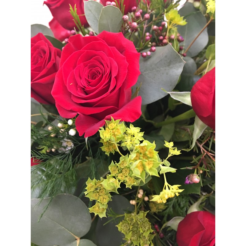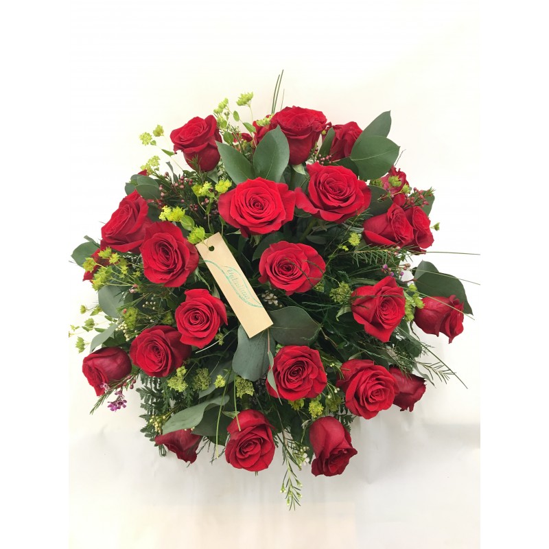Precioso regalo trabajado con las mejores rosas, y detalles de verdes muy interesantes que le da ese toque desenfadado. 30 rosas. (Medidas aproximadas 40-50 cm de altura, 50 cm diámetro)