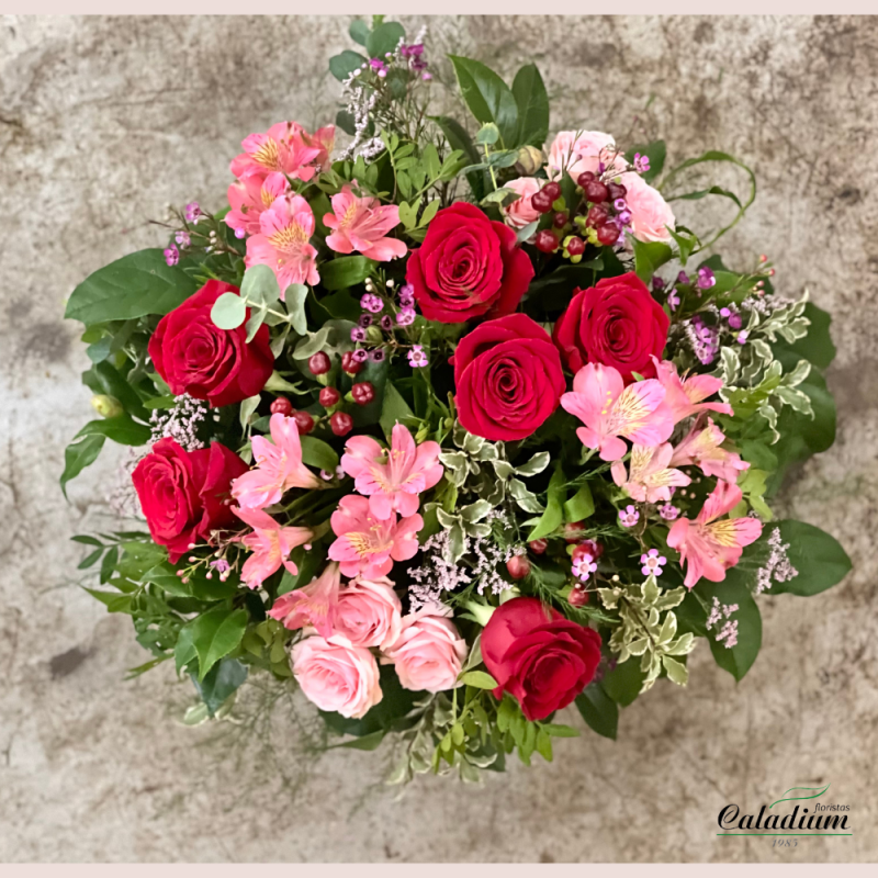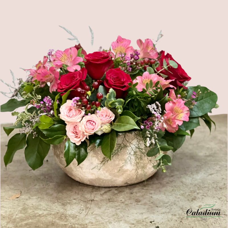 El centro Rubor es una delicada expresión de amor y ternura. Su armoniosa combinación de rosa, alstroemeria, rosas ramificadas, en tonos rojos y rosados, transmite dulzura, romanticismo y emoción, evocando ese rubor natural que nace cuando el corazón se acelera. Un arreglo elegante, ideal para San Valentin o para sorprender con un gesto lleno de cariño y sensibilidad.